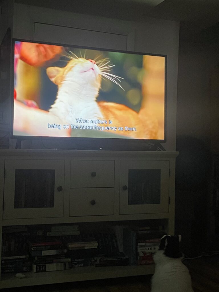 A few days ago, I watched the tremendously charming 2016 Ceyda Torun documentary Kedi, about the street cats of Istanbul. There are a lot. This follows the cats (often filmed at cat level) and the people who take care of them. The cats are cats–they have personality, some are assholes, some are picky eaters (the one who only eats smoked turkey and manchego, c’mon!), they do funny things, they are cute, the film is really fun. And also, my cat Smitty went absolutely nuts. He jumped off us, went to the TV, and started meowing at the cats. Here is a picture of that below, dark because we were watching the film but you can see what’s happening: